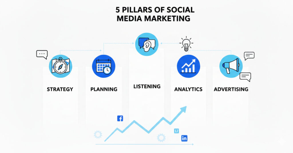 Effective social media marketing rests on five interconnected pillars. These components form the basic structure of any professional strategy.