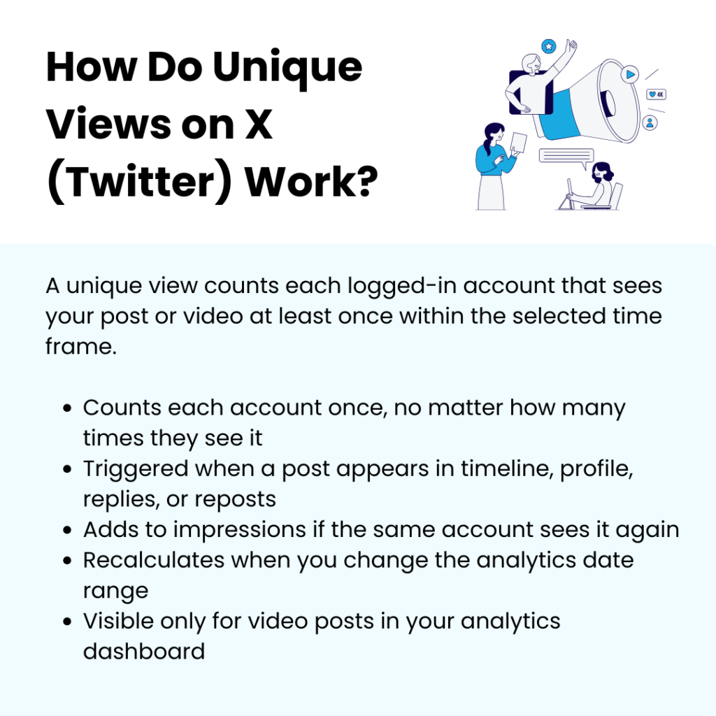 On X, a unique view is tied to a single logged-in account within a selected reporting window. When that account loads your post for the first time, it registers as one unique view. After that, additional loads from the same account during that time range don’t increase the unique count.