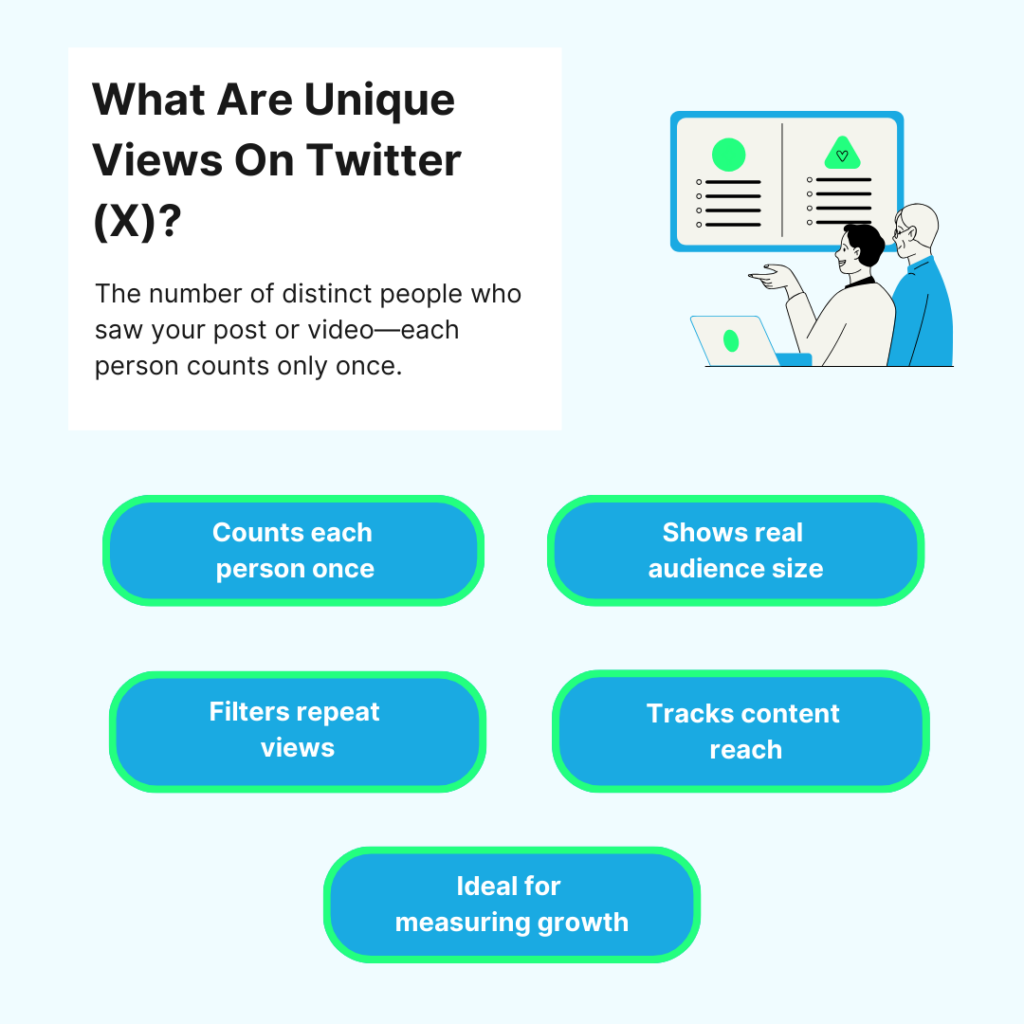 Unique views on X mean the number of distinct people who saw your post or video. Each person counts once, even if they see it multiple times.